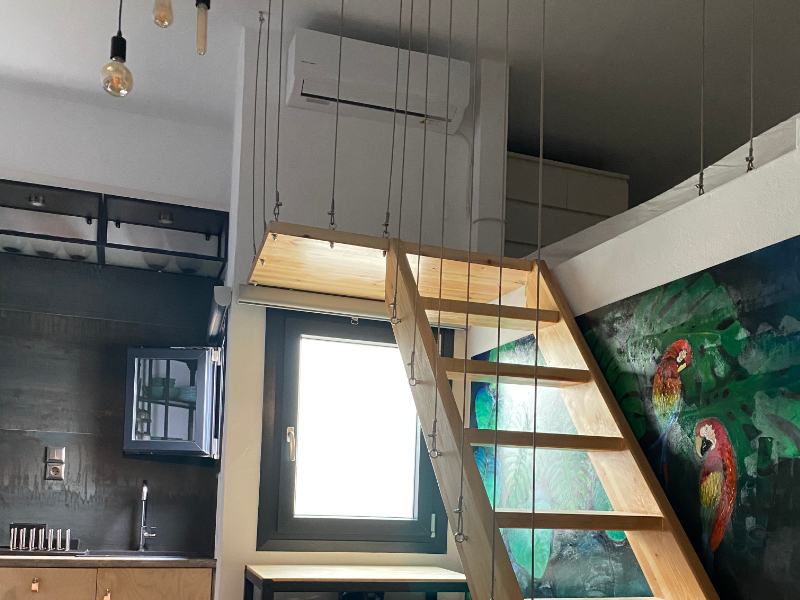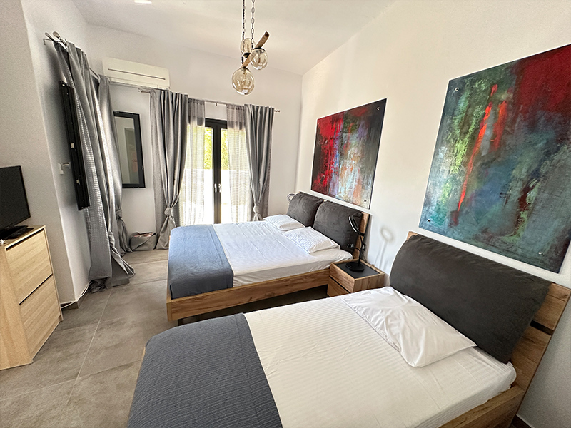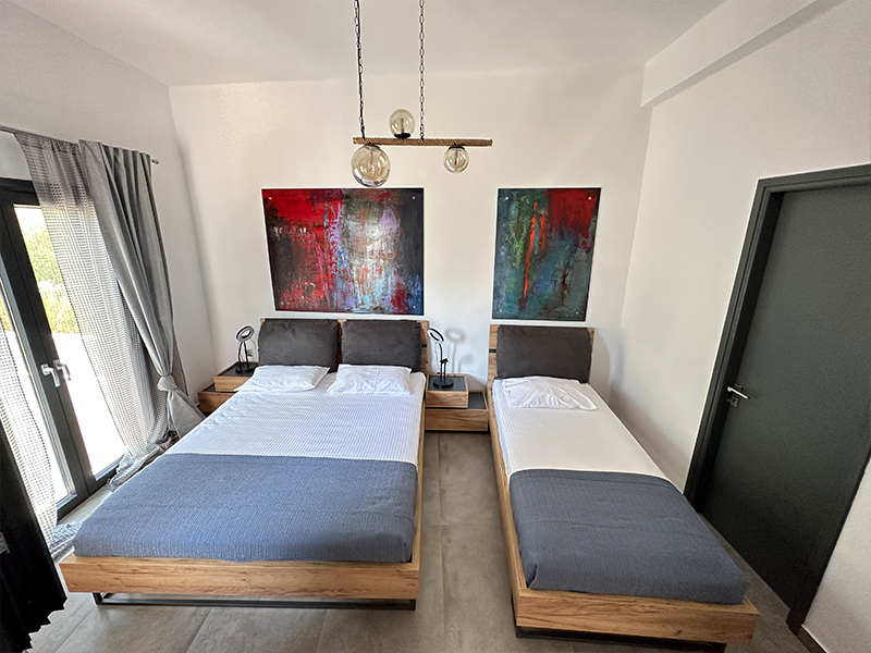 The interior of the ground floor house has a warm and welcoming atmosphere, offering a comfortable space that will make you feel at home. Enter a space decorated with a modern aesthetic, minimalist design and a touch of traditional charm. The master bedroom has a queen double bed and a single bed, a wardrobe, a chest of drawers, a flat-screen TV, air conditioning and balcony door with access to the courtyard.