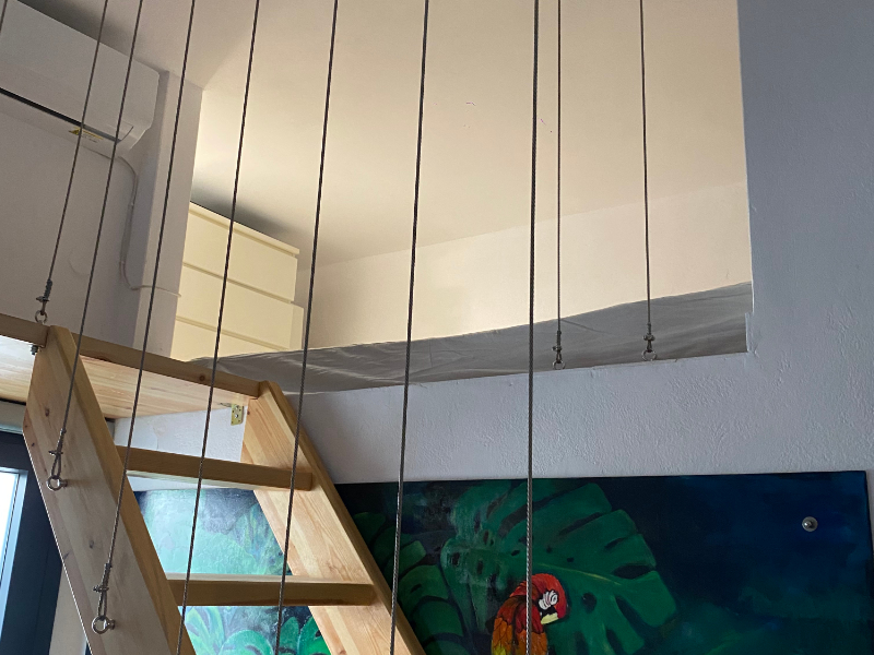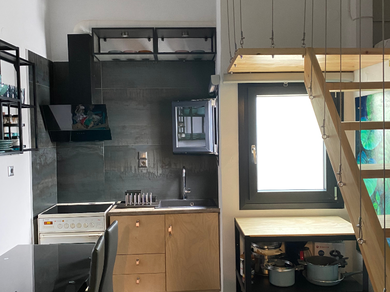 A raised area next to the kitchen has a double low bed for two additional guests and a chest of drawers.