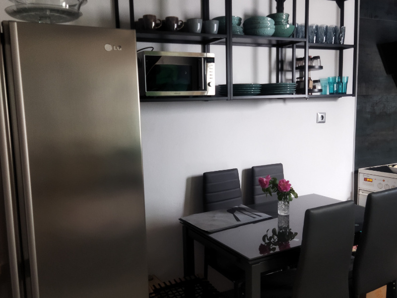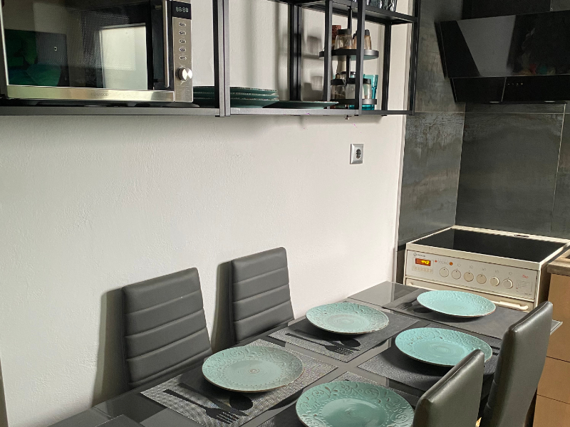 The open-plan kitchen area, which is complemented by a dining table for five people, awaits cooking enthusiasts and includes all the essentials, such as glasses and cups, pots and pans, dishes, cutlery, cutlery, kettle, microwave, fridge, stove with oven, toaster and filter coffee maker.
