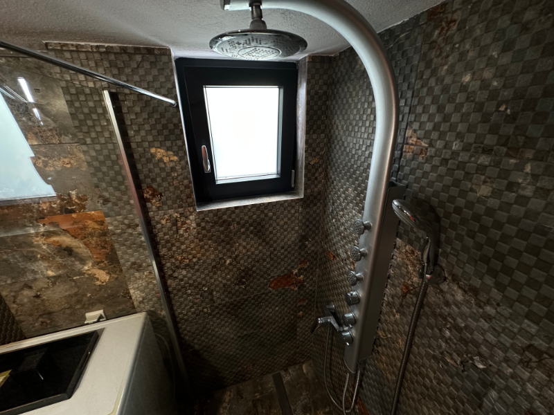 The spacious bathroom, equipped with a refreshing hydro-massage rain shower, hairdryer, and washing machine complements the modern atmosphere of the house.