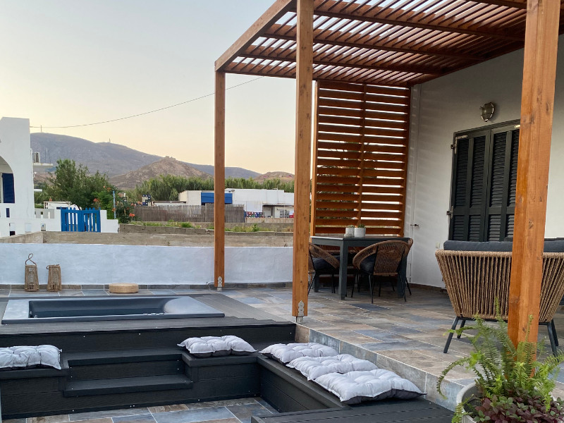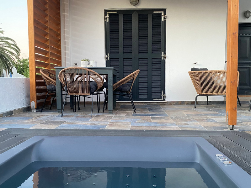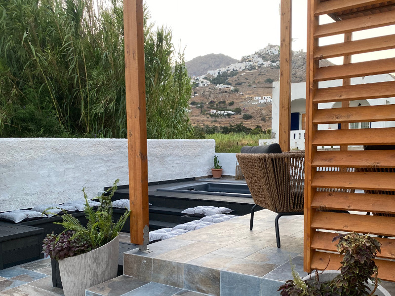 Relax in the comfortable pergola-covered courtyard, and enjoy the breathtaking views of the valley and Chora, the traditional old town of Serifos, perched on top of a hill. The outdoor dining area invites you to enjoy your lunch, coffee or drink in the open air, while the comfortable outdoor furniture ensures relaxation while enjoying the sunset. Your private Jacuzzi awaits to offer the ultimate relaxation.